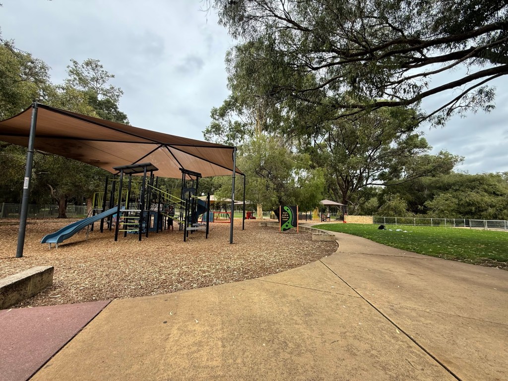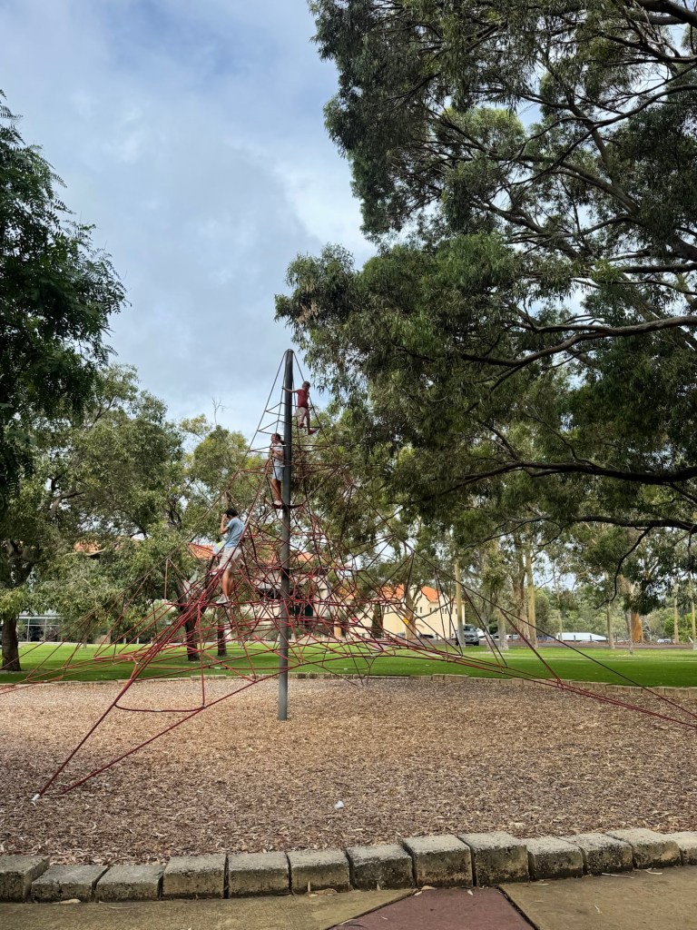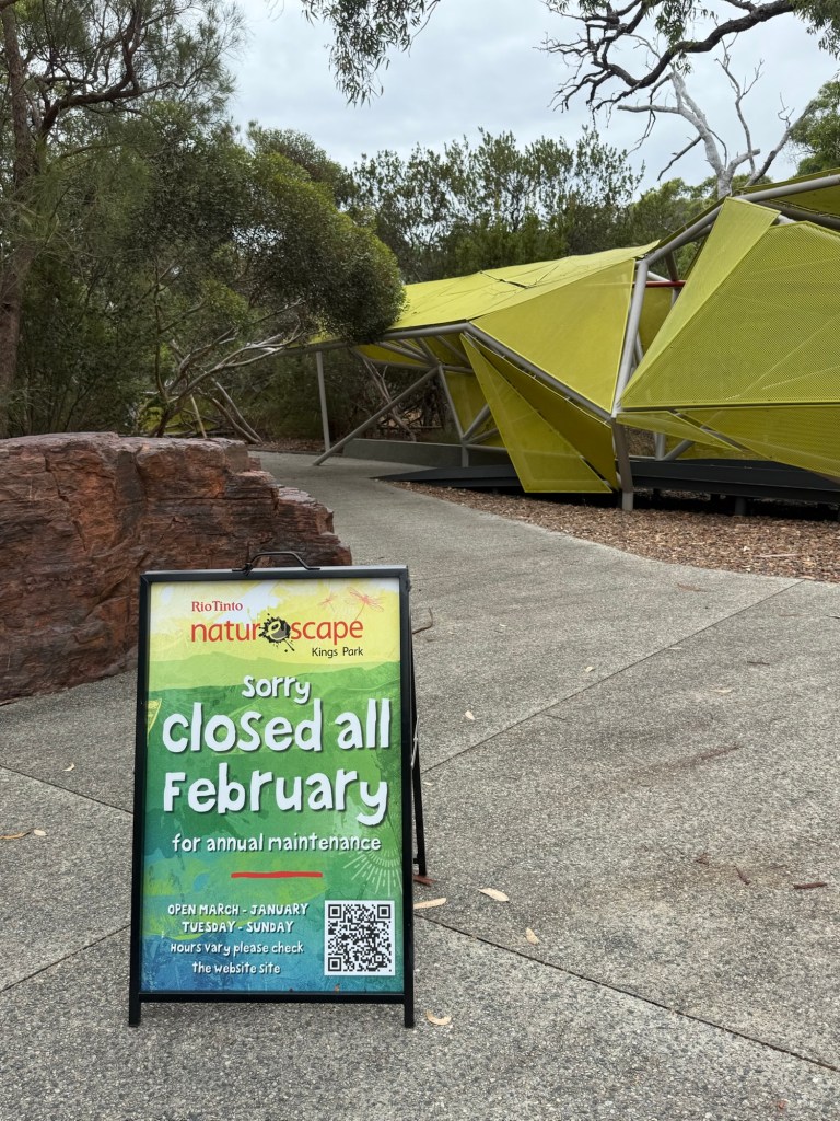 A very monarchical day today, apparently. Our first stop was Kings Park, which is Perth’s large Central Park. Within it is the Rio Tinto Naturescape, which looked amazing. It had all sorts of climbing structures and areas for kids to play. Unfortunately when we got to it we were faced with this sign: