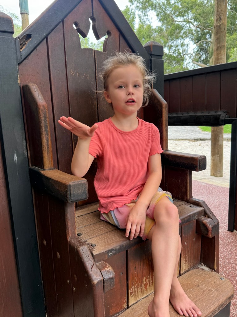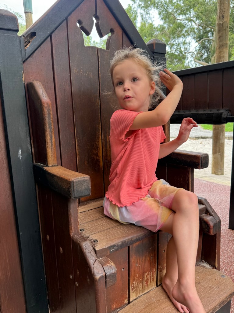 We continued walking through the park to find a playground. It wasn’t quite as magical as the naturescape would have been, but it didn’t stop Millie from playing for a couple of hours. Since it was midday on a weekday, the crowd skewed young. Millie dragged some toddlers around for a while and then pretended to be a queen on a throne.