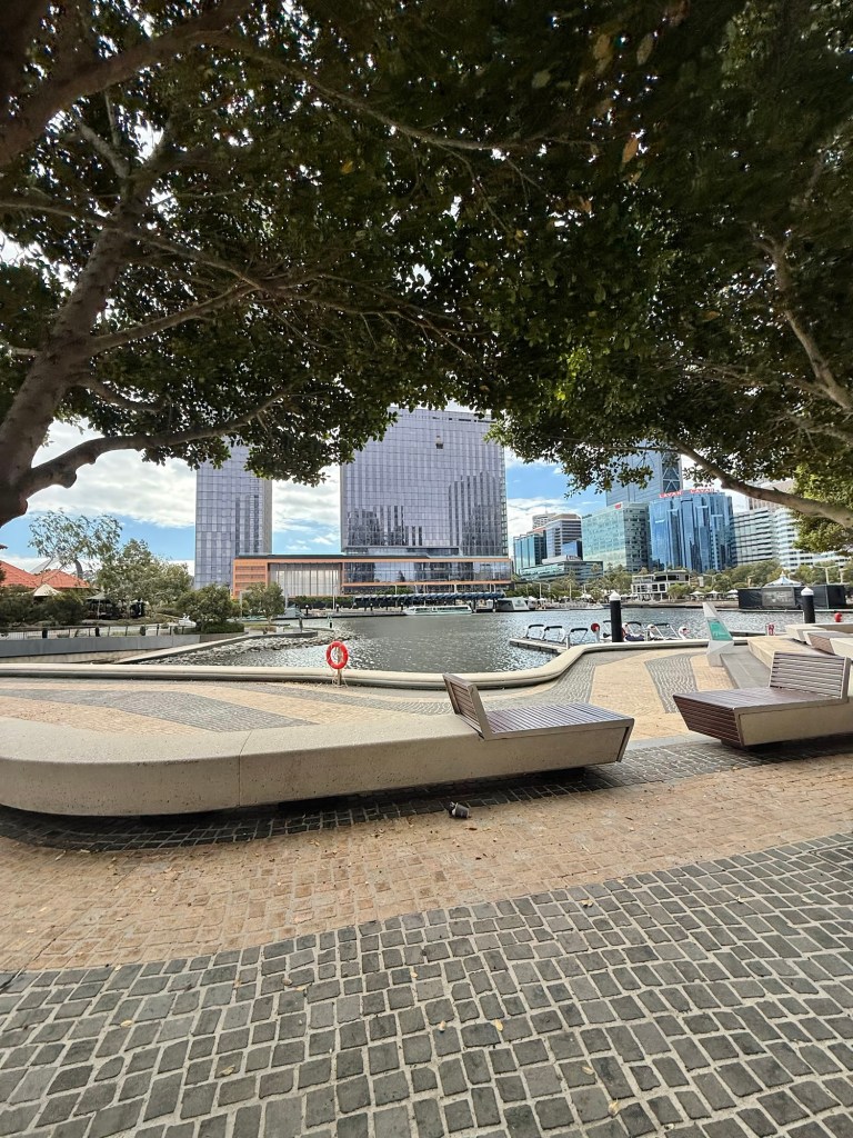 We arrived at Elizabeth Quay and sold a kidney to pay for parking. Then we walked along the water. It was full of people (despite my photos that make it look apocalyptic), a mix of corporate folks on their way to happy hours, people jogging, and families out and about.