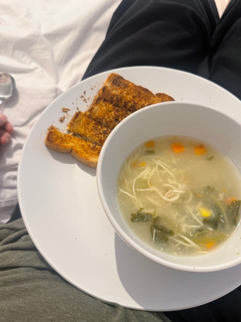 Millie jumped into Nurse Mom mode and brought me coffee. Nick entertained her and then a couple of hours later she set up a little bed station for me and brought me soup. (With lots of help behind the scenes from Nick of course).
