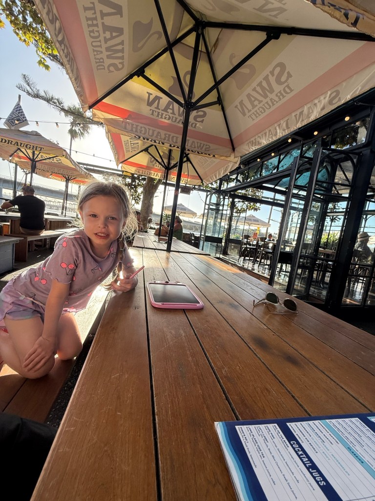 They got back starving so we immediately walked out to dinner. We have driven past this place every day we’ve stayed here and it always looks lively and like it has the best vibes. We walked about 15 minutes and got a table overlooking the swan river. It felt like an English pub by a body of water.