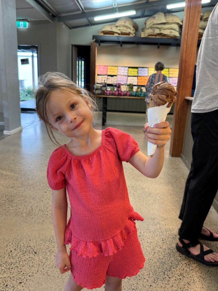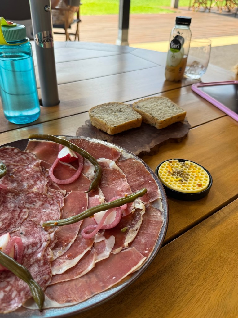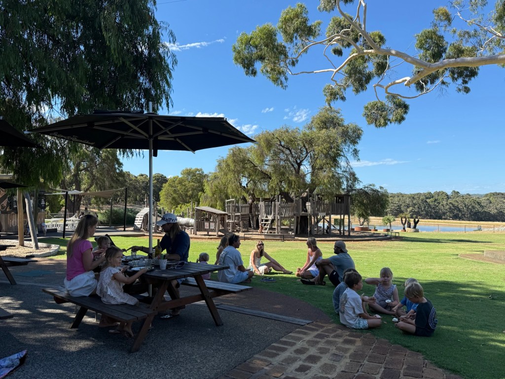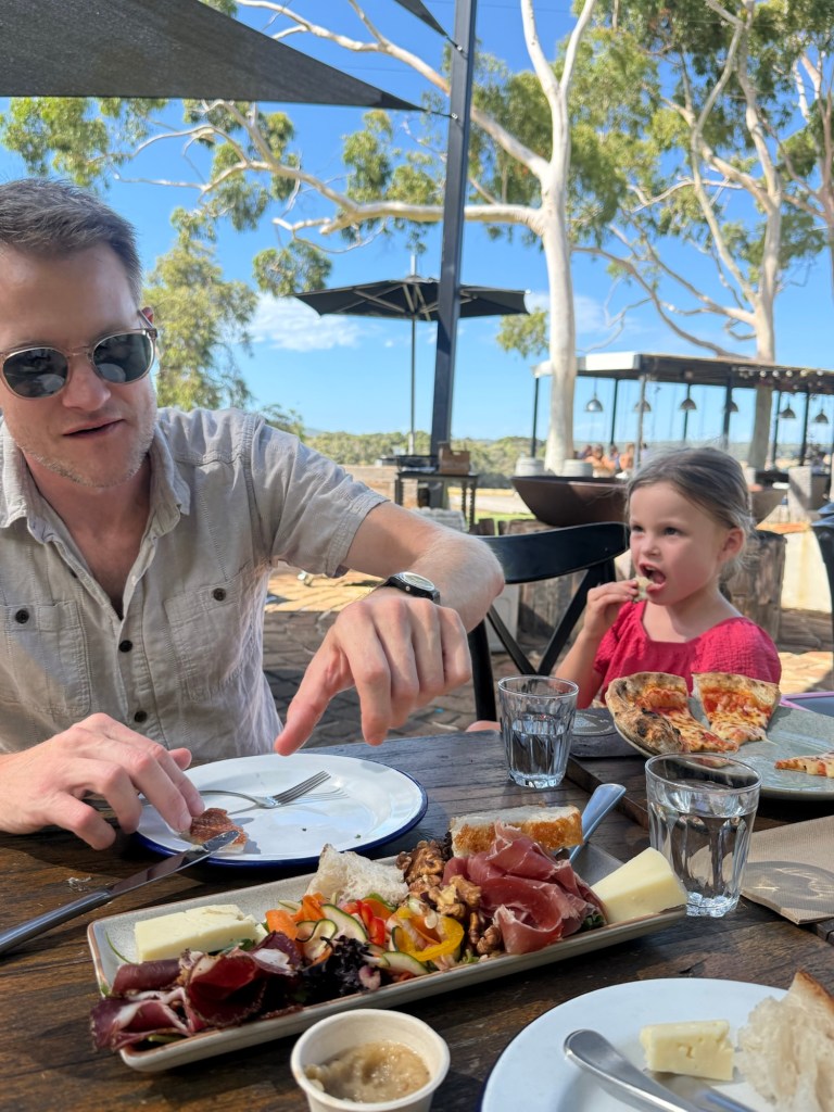 Our next stop was called “Swings and Roundabouts”. A terrible name but the best stop by far. It was huge and full of all sorts of people, from bachelorette parties to retirees. But mostly it was families. It had a massive playground and lots of grass to run free. We had an early dinner of wood fired pizza and more meats and cheeses.