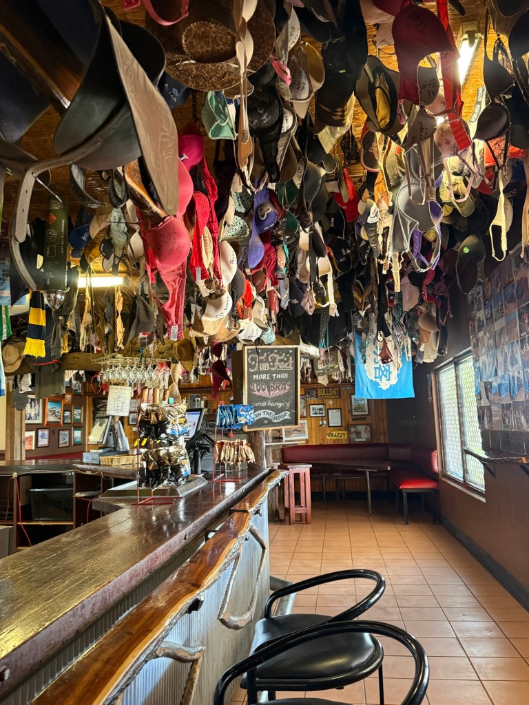 We stopped only once for gas and a bathroom break in Kulgera. This tiny gas station had a pub attached to it with a million bras hanging from the ceiling. In another lifetime we would have stayed here for the night, but we drove on.