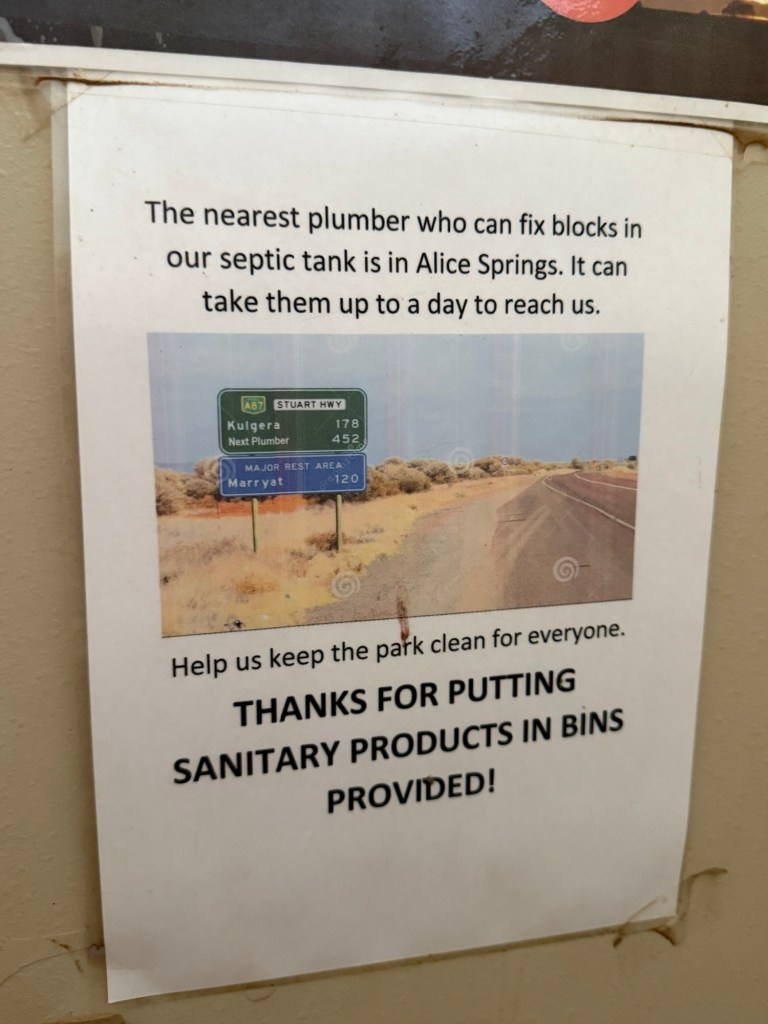 This sign in the bathroom stall was a good reminder that we are really in the middle of nowhere.