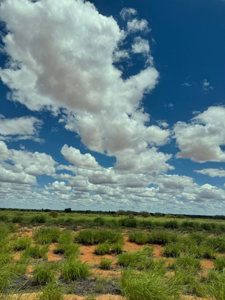 We watched as the landscape changed slowly as we drove North. We started in the desert, surrounded by manmade piles of pulverized sandstone from the mines. The dirt got brighter and brighter over a couple of hours, until it was a deep orangey red. The clouds went from wispy to voluminous and defined. Then, as we crossed over into the Northern Territories, the plants started getting bigger and greener.