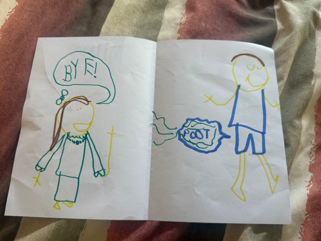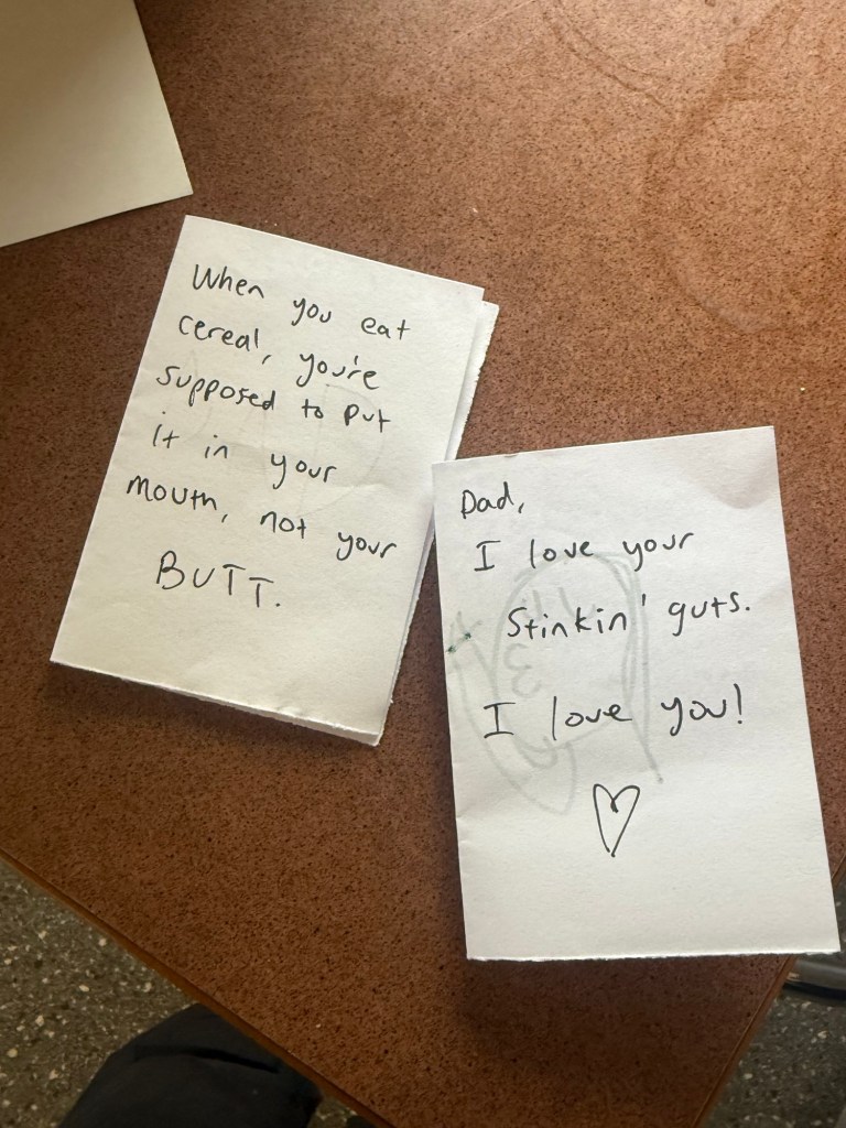 Millie was up somewhat early and spent the morning making us “cards” with inspired messages. She is at the ultimate age for potty humor, as am I. I couldn’t stop laughing at the concept and illustration of Nick eating cereal with his butt.