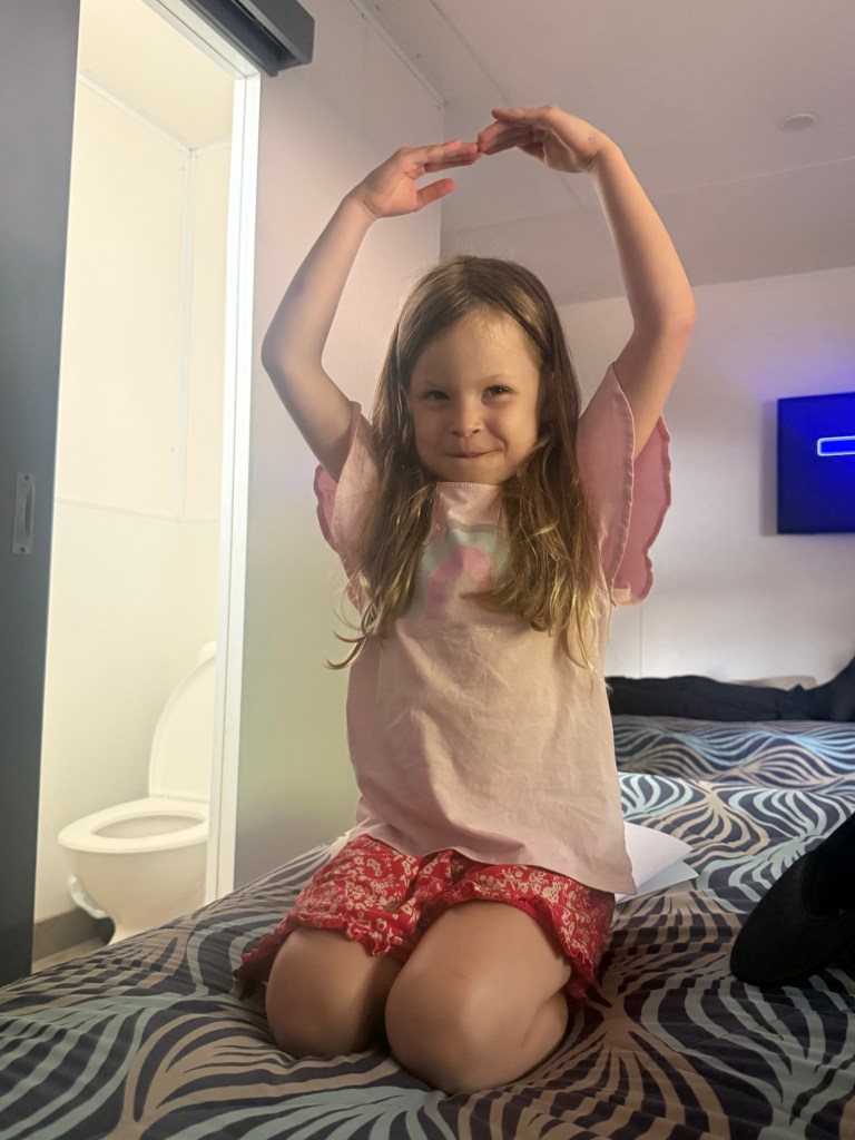 We got to our room and played a bit while I rested my eye. Millie played a round of charades, except she is awful at acting things out. She just contorts her body into a shape and sits still until we guess it. Here she is as a purse and a phone.