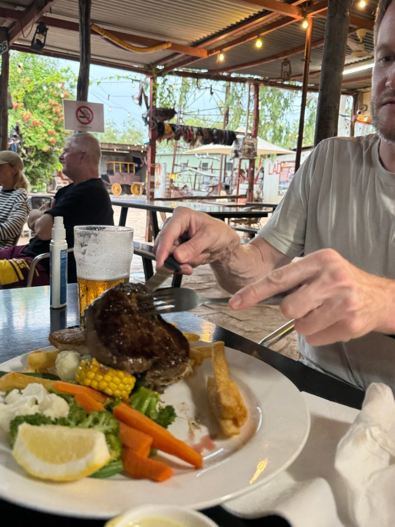At 6pm we walked over to the pub area and ordered dinner. Nick and I shared their famous “beef n’ barra”. Barra is short for Baramundi and they had a big thing on the wall about the couple who catch the fish and drive it down to them.