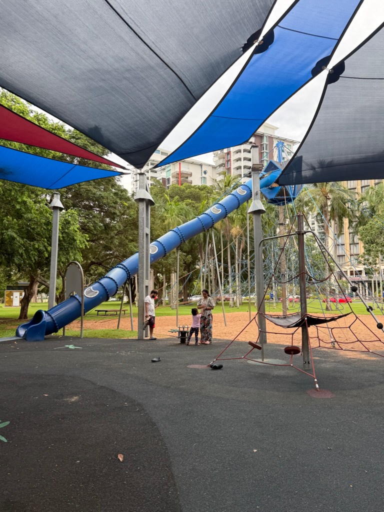 We walked along the shore to find a playground. The entire beach is closed because it’s box jellyfish fish season, another animal that wants to kill Australians. We found a great, huge playground. Millie got lots of energy out after so much car time.