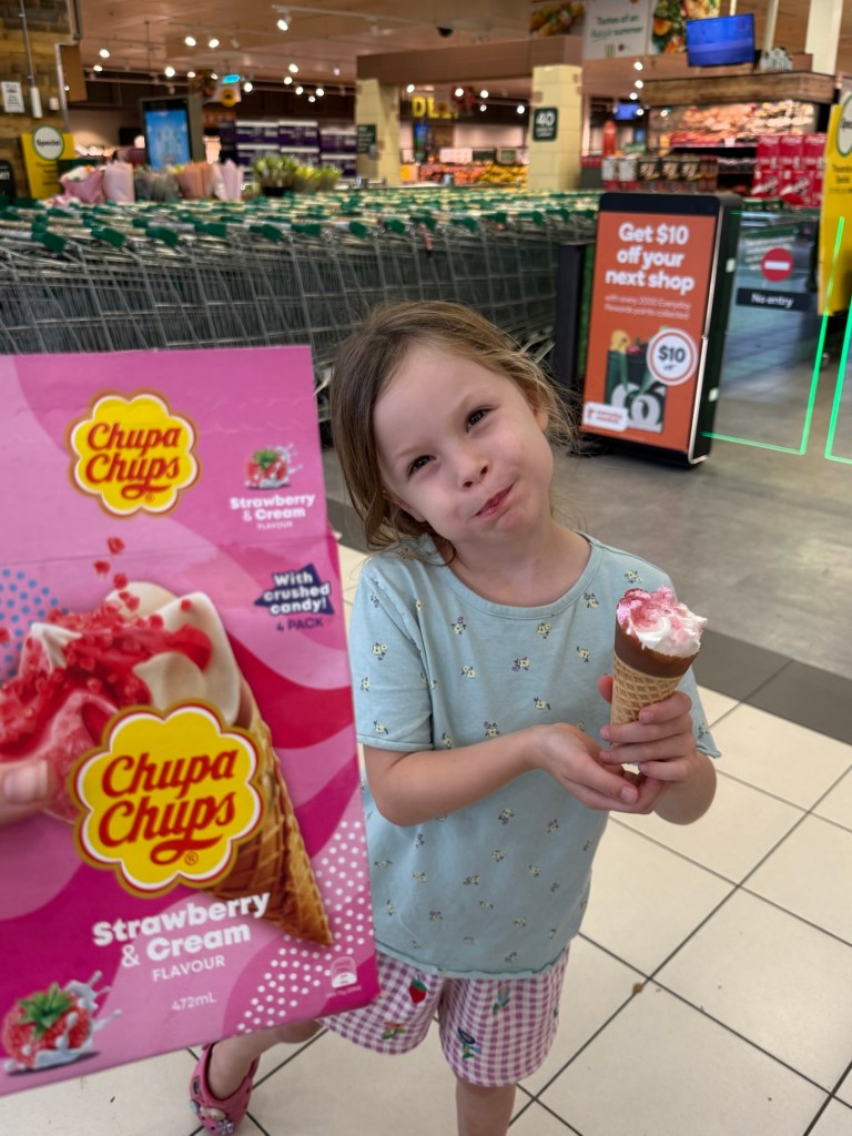 Millie befriended a kid named Henry and they ran wild for 30 minutes or so. By the time we left, it was raining heavily. We decided to just lean into it. We went to the grocery store to get basics for dinner and an ice cream cone for Ice Cream Friday.