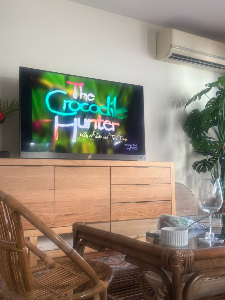 Second order of business; snack plate and crocodile hunter education. We are going to Steve Irwinās zoo in the next couple of days and wanted to get Millie up to speed on who he is. We watched a couple of episodes and she perfected her incredible impression of him. She said ānointeen nointy noinā (1999) and āaw krikeyā. It makes us laugh every time.
