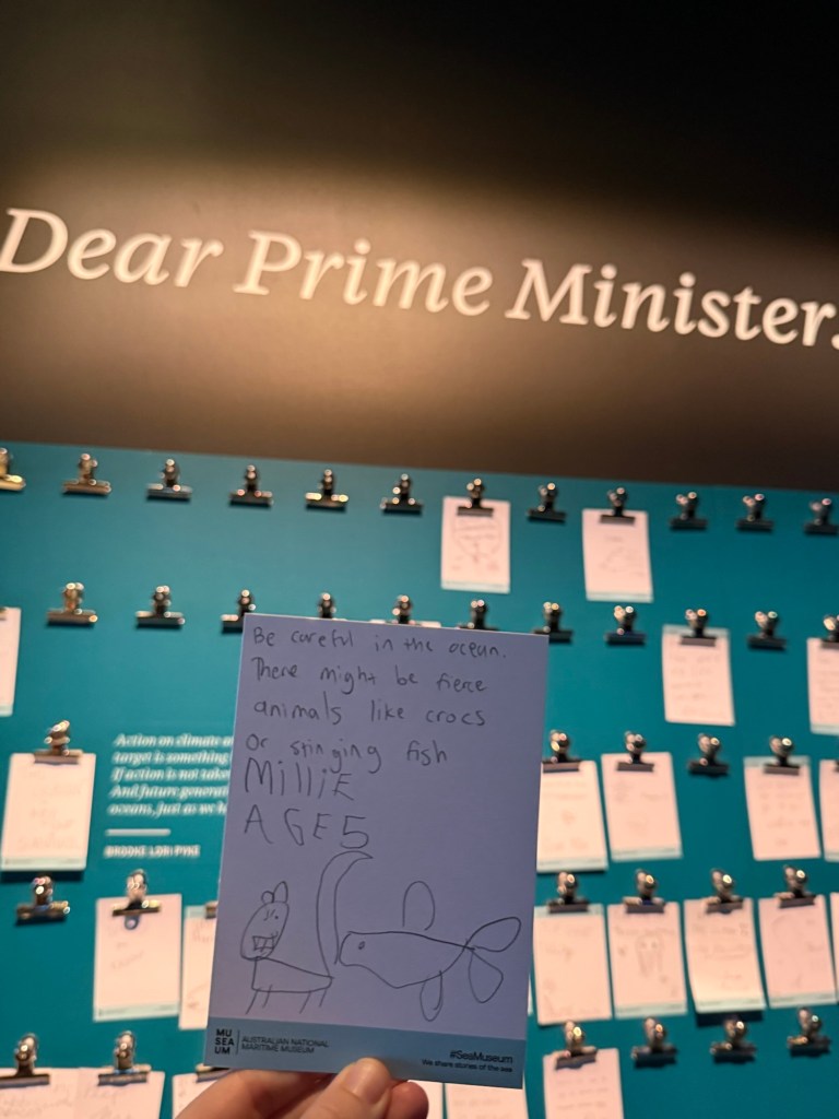 And like yesterday there was a wall to leave a note behind on. This one was “Dear Prime Minister…” where the visitor was prompted to share a note about our oceans. Most were about protecting reefs, reducing trash, etc. Millie didn’t quite understand the prompt and left this warning for the Prime Minister about the oceans.