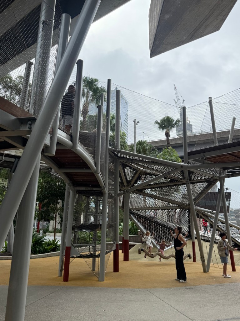 We made it to the ribbon playground. It was huge and awesome and mostly covered by the overpass. Millie ran around asking every girl within the age range of 4-10 if they’d like to play. She found a couple of takers and played for about 30 minutes as the rain came down harder and harder.