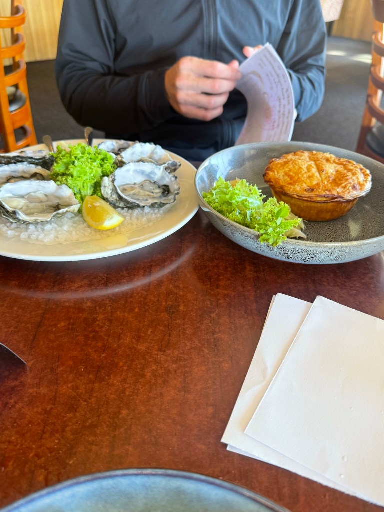 We went to have an early dinner at the only restaurant in town that was open at 4:30. It was completely empty but every table had a “reserved” sign on it and the waitress acted like she was doing us a big favor by seating us. The service in all of Tasmania has been strange. Despite it, the food was great. Nick got oysters and a scallop pie, and I had squid. These oysters were delicious, so maybe I do like them? Who knows.