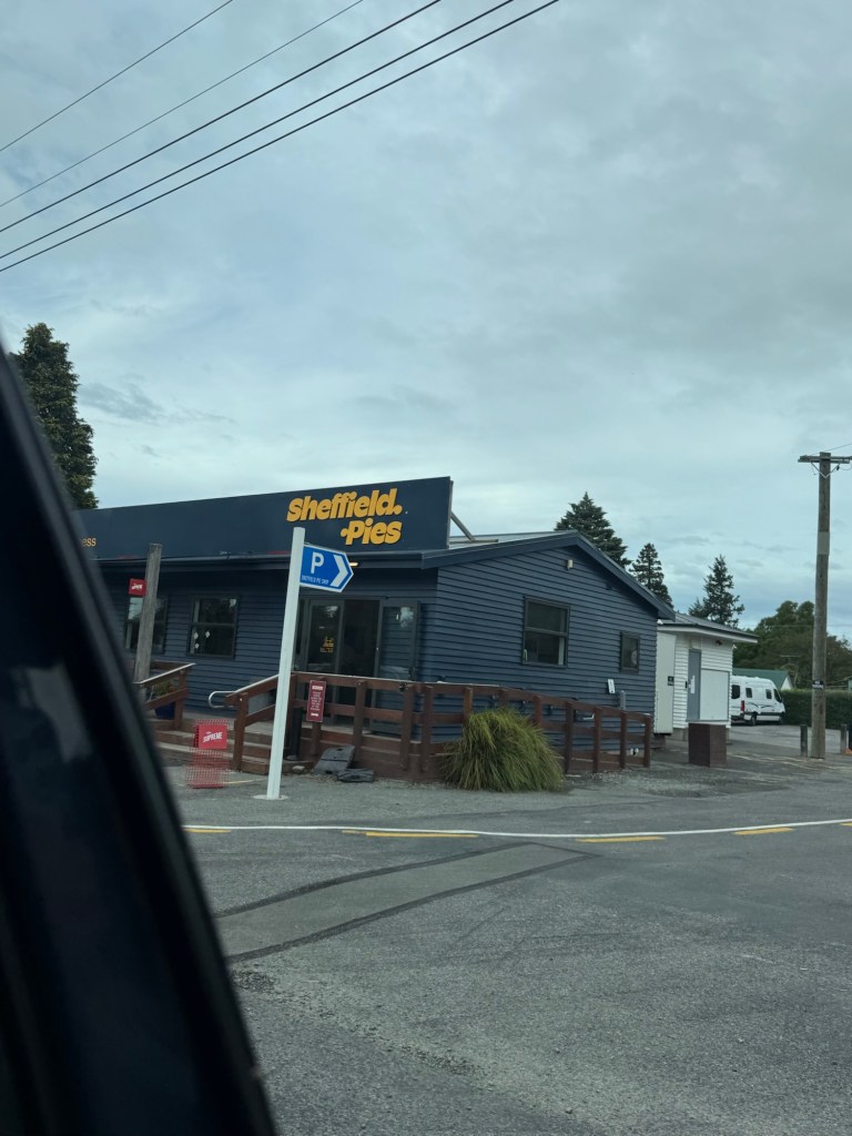 After throwing approximately 75 rocks into the water, we walked back to the car. Next stop: Sheffield pies. Sheffield is a small town and home to a famous pie shop. NZ is known for its meat pies so we had to try one.