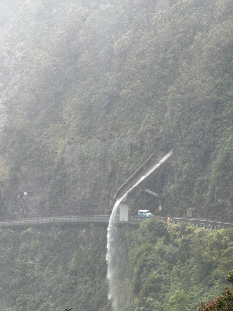 It rained most of the way there but we got a break when we arrived. We walked across a bridge and down to the gorge. The water was bright blue from the silt in the mountains. We think it’s the same thing that made the water in the Omani wadis bright blue. Whatever it is, it was breathtakingly beautiful.