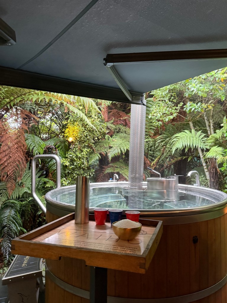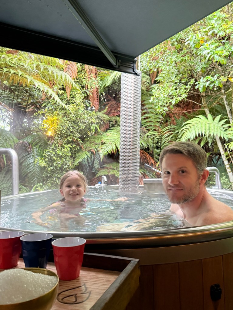 They are private hot tubs, filled with glacier water and then heated with a wood stove. Let me set the scene: the smell of woodsmoke, the sound of raindrops and birds, privacy due to the thick greenery, and perfectly temperate hot water. It was extremely romantic, even with a 5 year old who kept pouring cold water on our heads to “make a trick on us”.