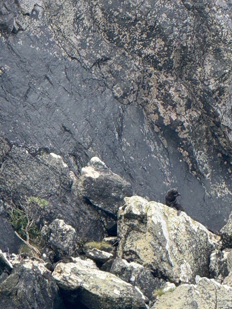 We saw dolphins alongside the boat, and a little fur seal pup on a rock. Poor Millie slept through it all.