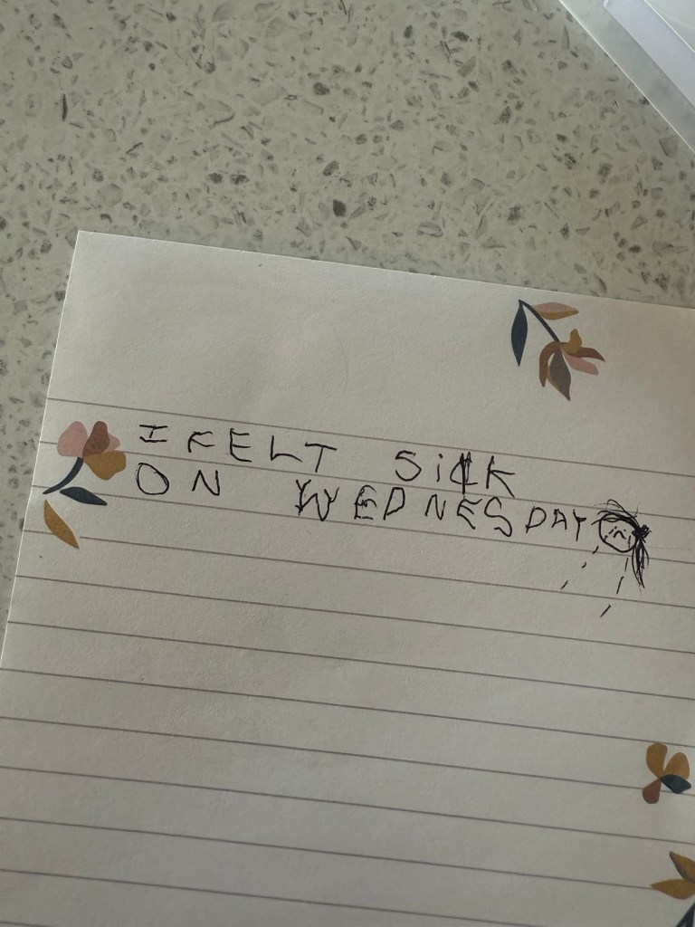 In the kitchen I found this note. Sweet sweet girl.