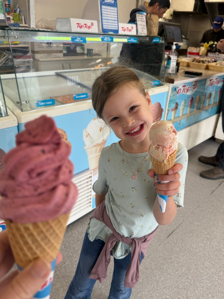 We remembered it was Friday and walked to an ice cream shop / Chinese takeout / fish n’ chip shop to get the goods. I joined Millie this week since they had this special NZ-style ice cream where they blend fresh fruit into a soft serve.