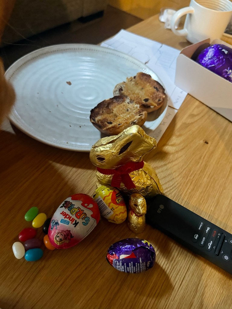 She had a hot cross bun and a kinder egg for breakfast.