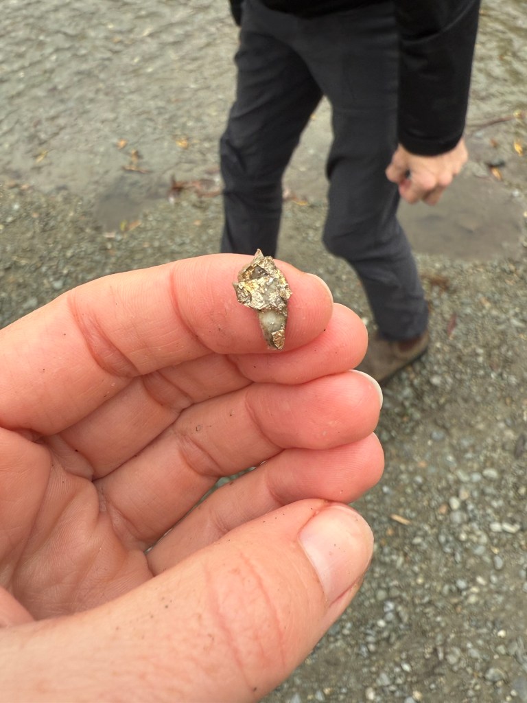 There were a few other families there, all with kids who had lost interest and dads who were determined to find something. After about 20 unsuccessful minutes, I saw Nick pick something up. It glimmered in the sun and I thought “Eureka!”. We examined it up close.