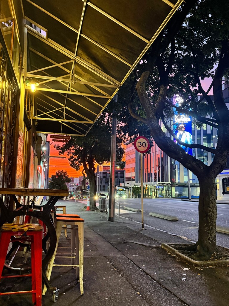 We came back to the room for about an hour to drop everything off and rest, and then went for a mediocre dinner nearby. We ate outside and watched an unbelievable sunset through the buildings.
