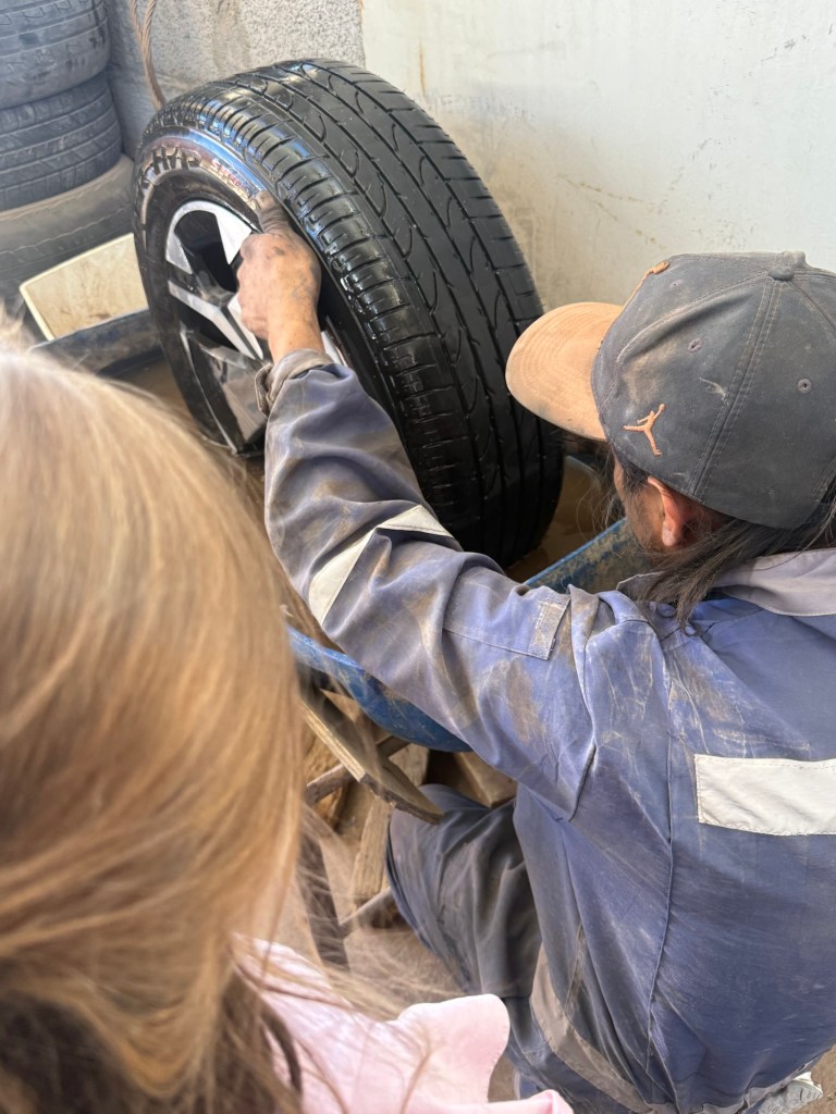 We didn’t have service so we drove verrrry slowly to the edge of town and messaged our helpful Airbnb host asking for a recommendation for a tire shop. We didn’t even want to mess with the spare since it would be a disaster on these rocky roads. We spent another 30 minutes or so calling various numbers on our rental paperwork and confirming that our insurance would not be void if we get it fixed, and that they would cover the cost. About an hour later we carefully pulled into a rustic tire repair shed.