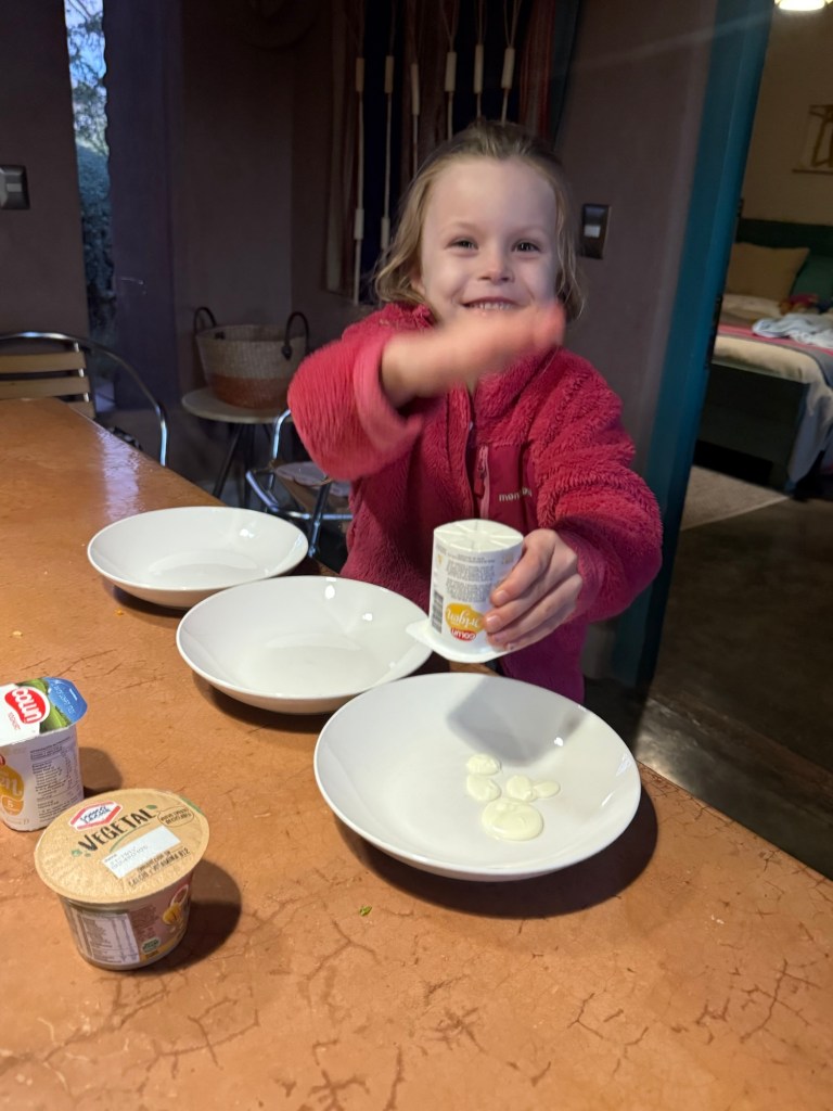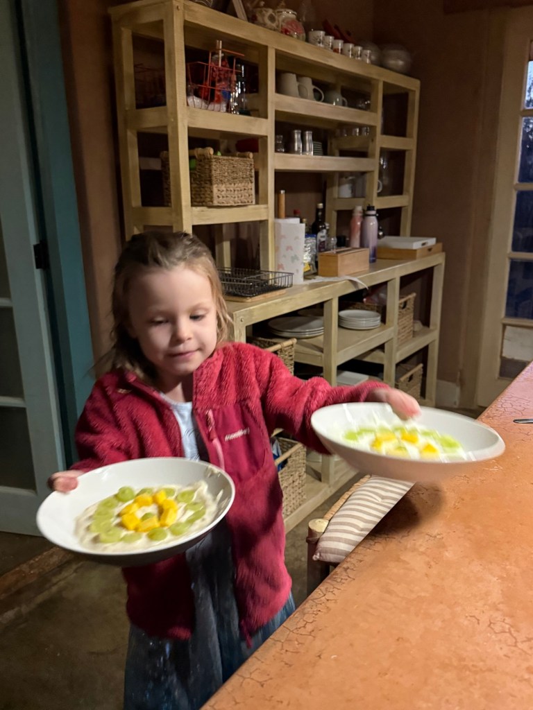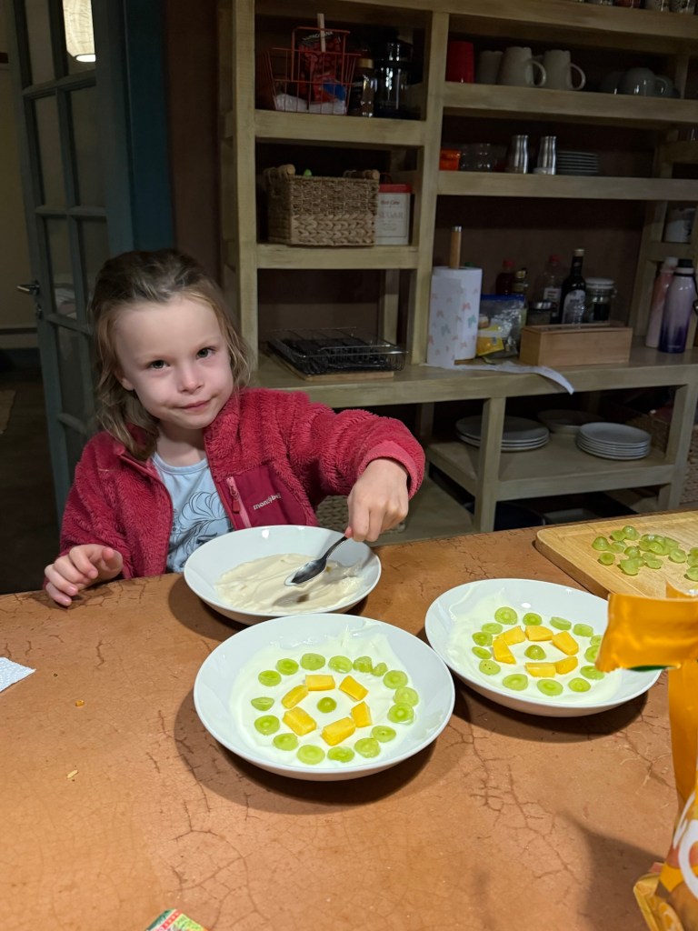 Since the afternoon she had been saying that she wanted to make a surprise dessert for us. She made a whole plan in her head and chose ingredients at the grocery store. I worked as her assistant (she kept calling me her “servant girl” which was slightly off-putting) and she made us these yogurt bowls with arranged fruit on top. She even found a dairy free yogurt for Nick.